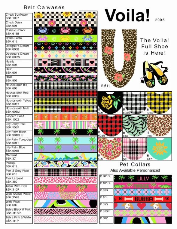 | Here is Page 2 hand painted needlepoint belt canvases, as well as needlepoint ballerina full shoe canvases and our new selection of pet collars which are available personalized. We finish our 45 inch belt canvases in a wide variety of styles and leather colors. Be sure to ask your needlepoint shop to order Voila! canvases for you! |